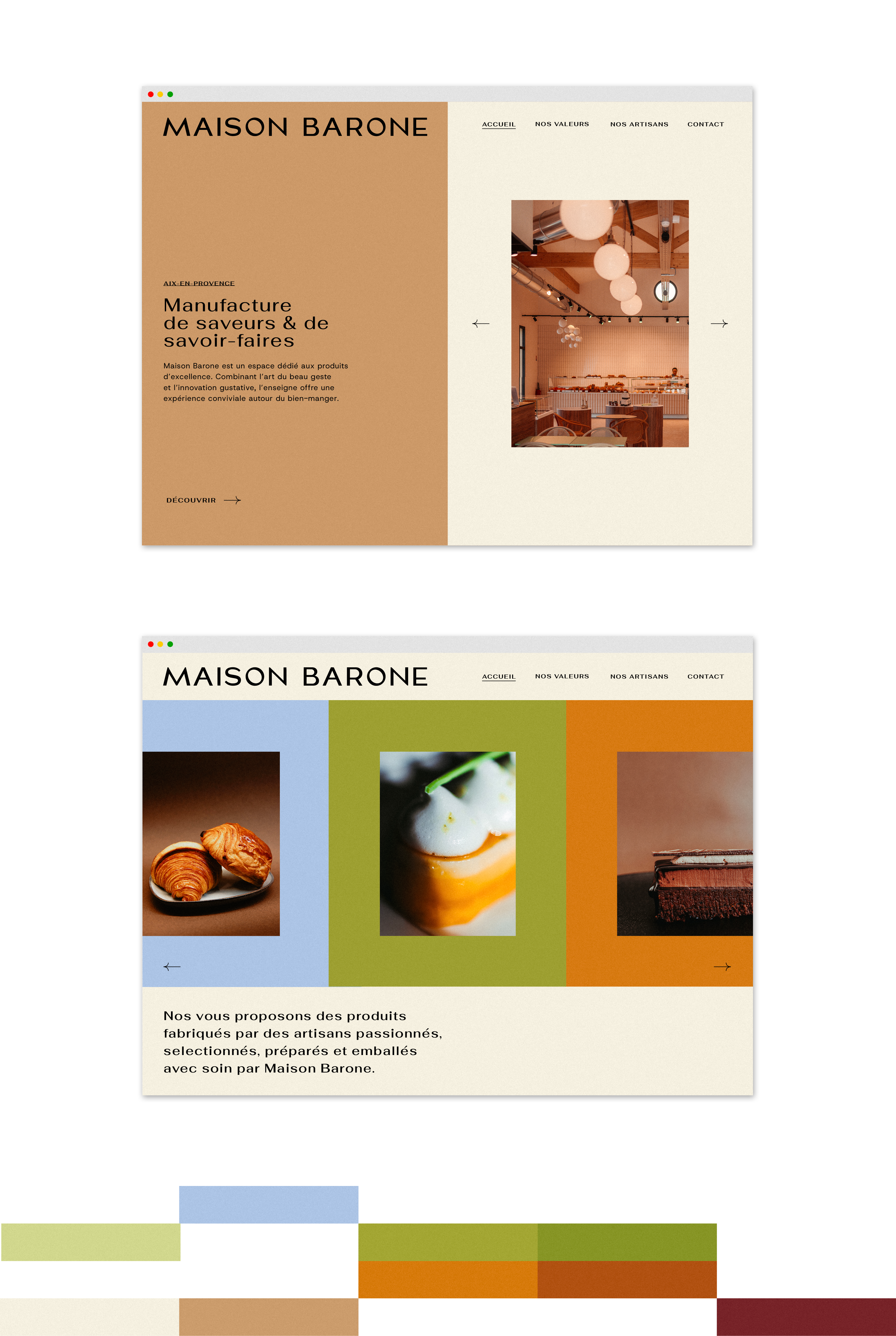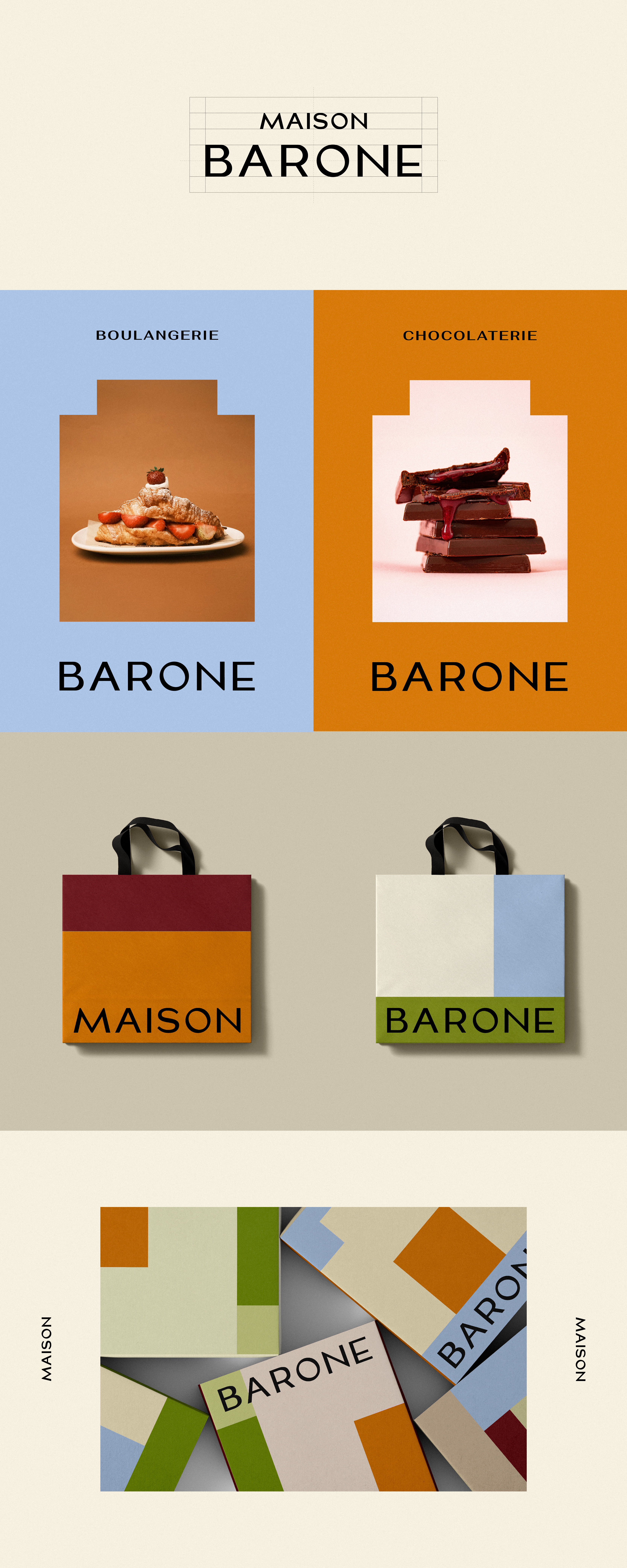 Artistic direction for Maison Barone, new food hall in Aix-en-Provence. Design of an evolving visual identity focused on a typographic block mark, a multicolored iconographic system and graphic packagings for each space.